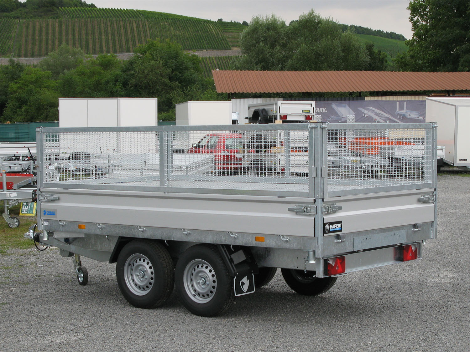 3-Seiten-Kipper mit Hydraulikzylinder und elektrischer Bedienung mit Batterie.