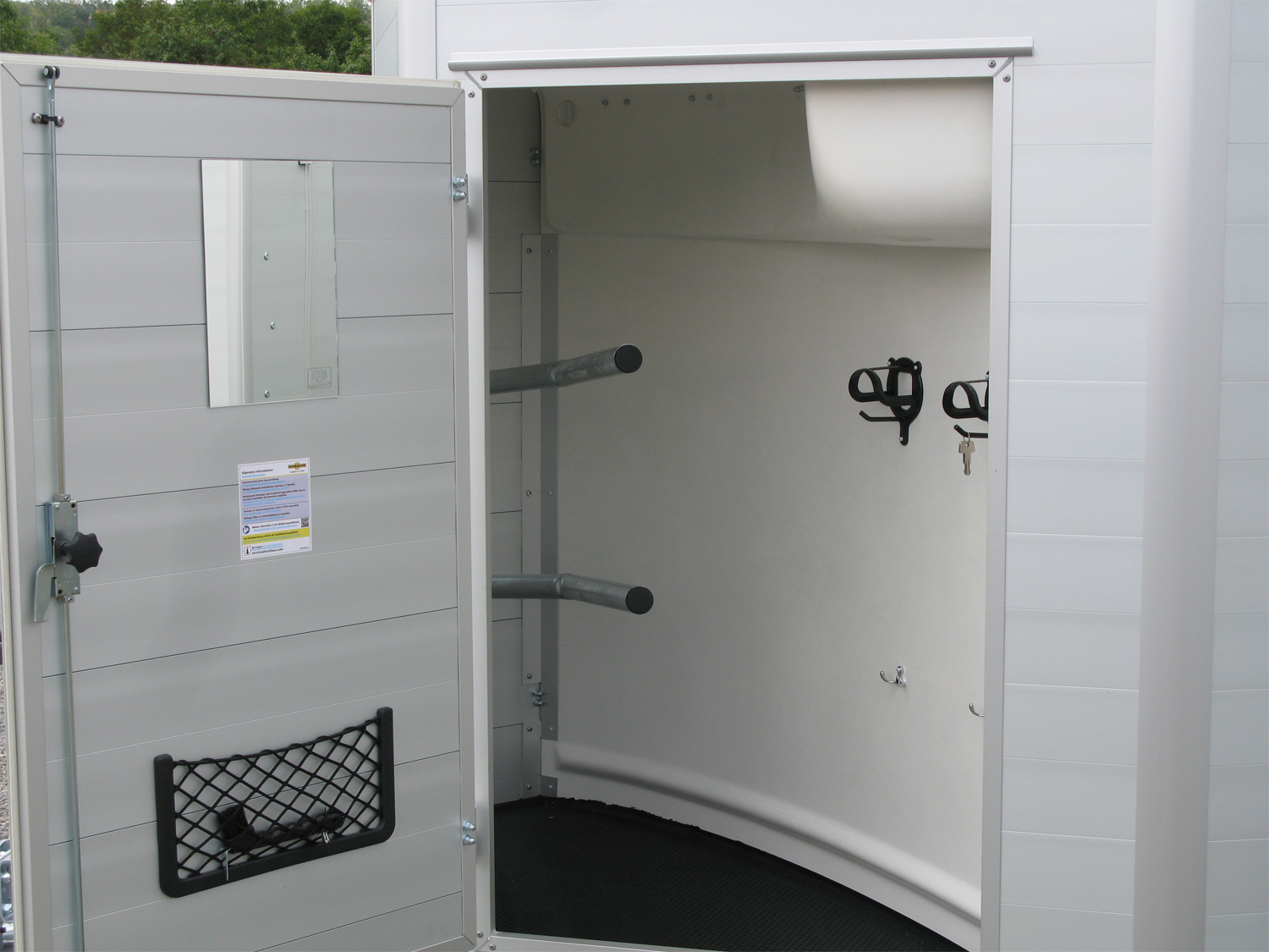 Der verrottungsfreie Alu-BiComp-Boden und der eingeklebte und versiegelte Gummiboden sowie der serienmäßig vorhandene Seitentrittschutz sorgen für eine lange Lebensdauer des Alu-Anhängers. Die abschließbare Sattelkammer ist mit Sattelhalter, Trensenhalter, Spiegel und Netz ausgerüstet.