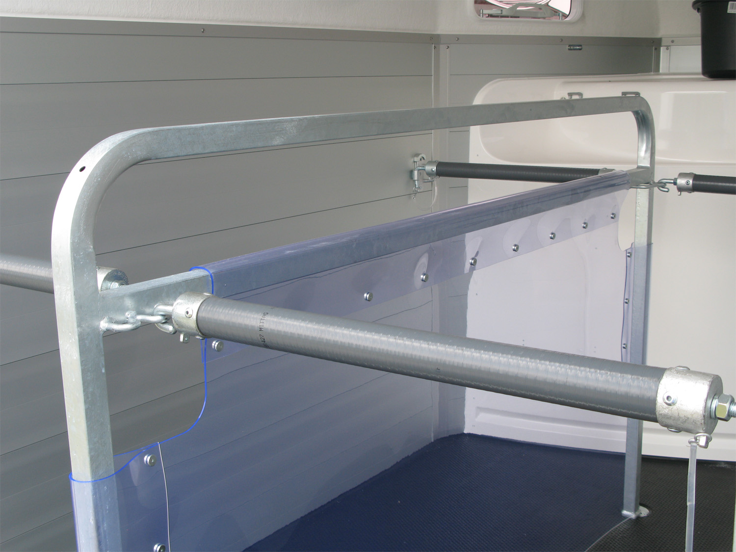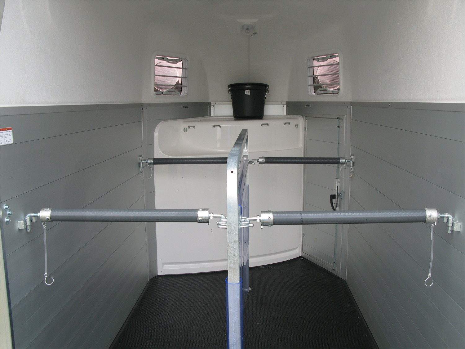 Die Pferde profitieren von den geteilten Brust- und Heckstangen mit Panikentriegelung, den getönten Ausstellfenstern in der Polyhaube und dem Windschott, das für zugfreie Innenraumbelüftung sorgt. Die verriegelbare Trennwand EquiLock® lässt sich leicht bedienen und sorgt für sicheren Halt auch bei geöffneter Heckklappe.