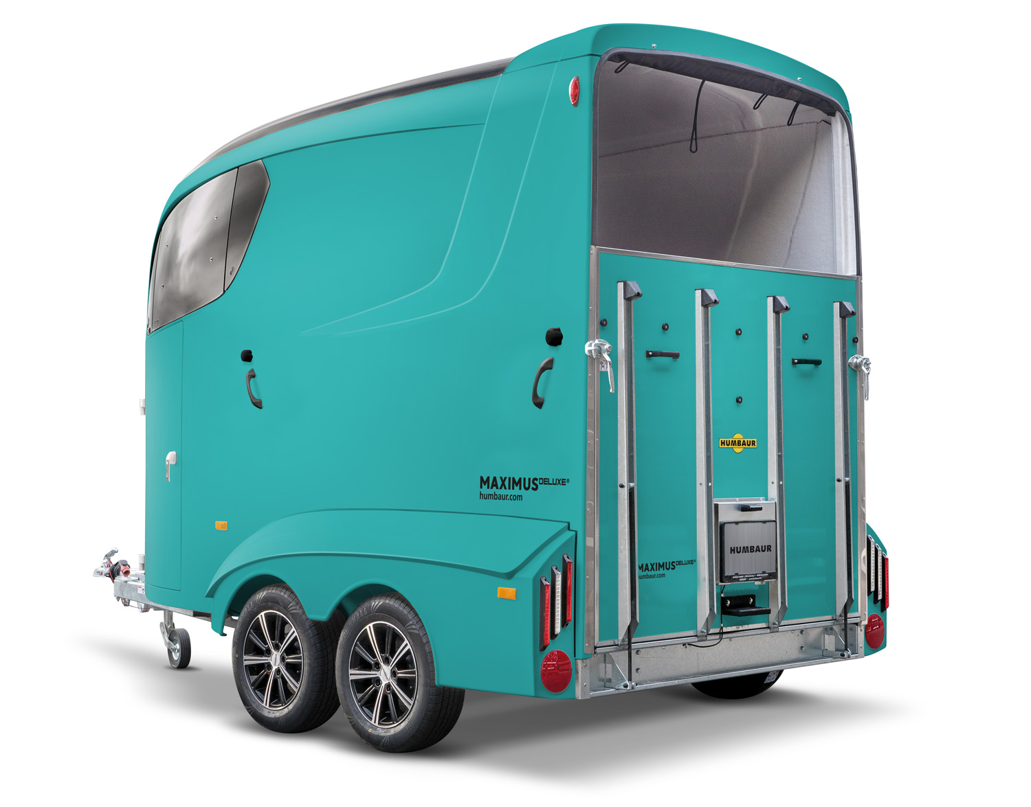 Das Beste, und zwar ohne Kompromisse? Der Maximus DELUXE bietet Vollausstattung in Serie, da bleiben keine Wünsche offen. Zur Serienausstattung gehört das blendfrei getönte Panoramafenster, das speziell auf empfindliche Pferdeaugen abgestimmt ist. Aerodynamische GFK-Kotflügel und zweifarbige Leichtmetallfelgen verleihen dem Luxusliner eine besondere Note. Praktisch: durch die unterteilte Sattelkammer gibt es noch mehr Stauraum mit vielen Ablagefächern. Mit diesem Spitzenmodell der HUMBAUR Pferdeanhänger-Kollektion wählen Sie Sicherheit und absoluten Komfort für Mensch und Tier.