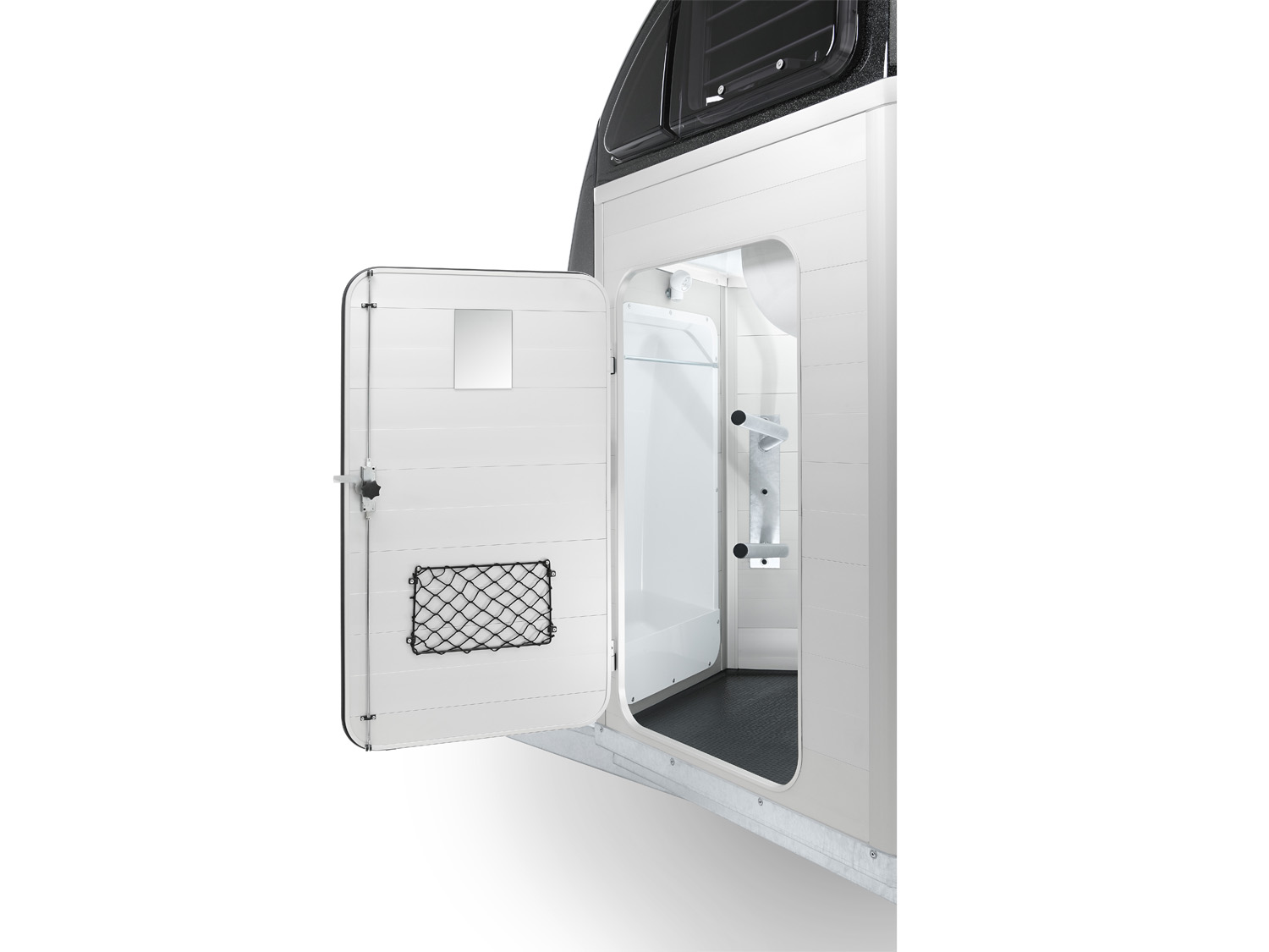 - Abschließbare Sattelkammer mit Sattelhalter, Trensenhalter, Spiegel, Netz, Innenbeleuchtung, Schaufel und Besen