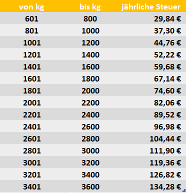 Die Steuern für einen Anhänger mit 1.300 kg zulässigem Gesamtgewicht werden wie folgt berechnet: