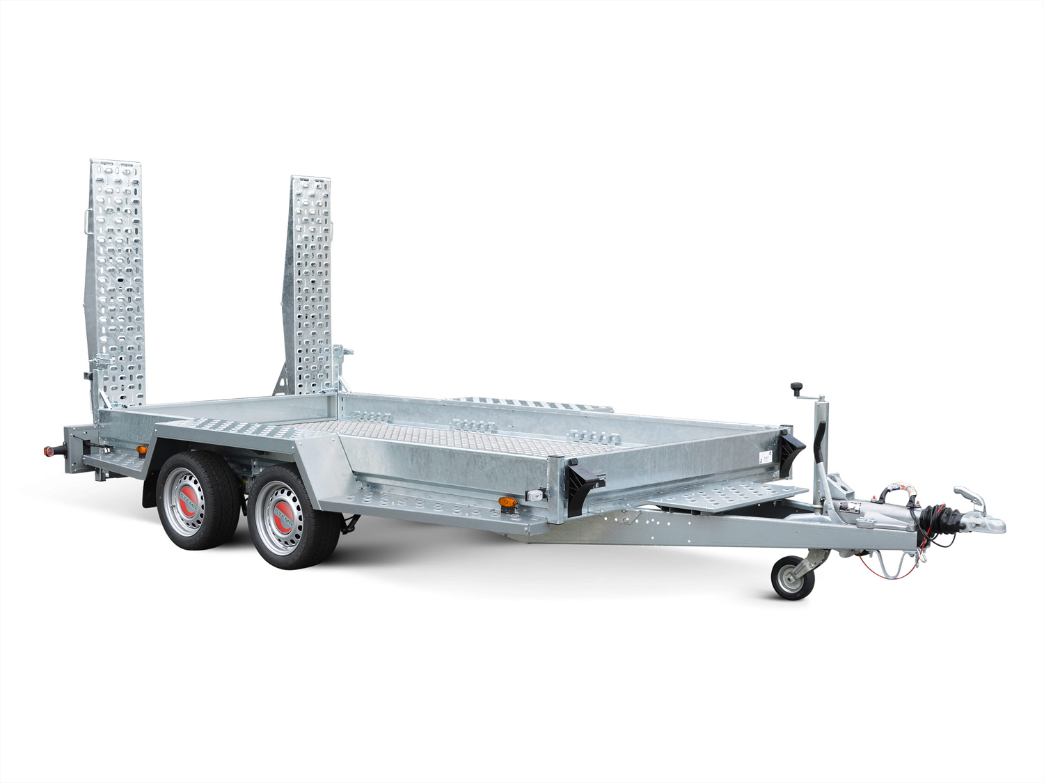 Für jeden Einsatz. Der universell einsetzbare STEMA-Baumaschinentransporter ist der ideale Begleiter für den gewerblichen Einsatz. Baumaschinen und andere Arbeitsgeräte lassen sich durch den extrem niedrigen Auffahrwinkel (18°) über die stabilen Auffahrrampen (1,70 m lang) mühelos verladen. Die Ladehöhe beträgt ca. 46 cm.
