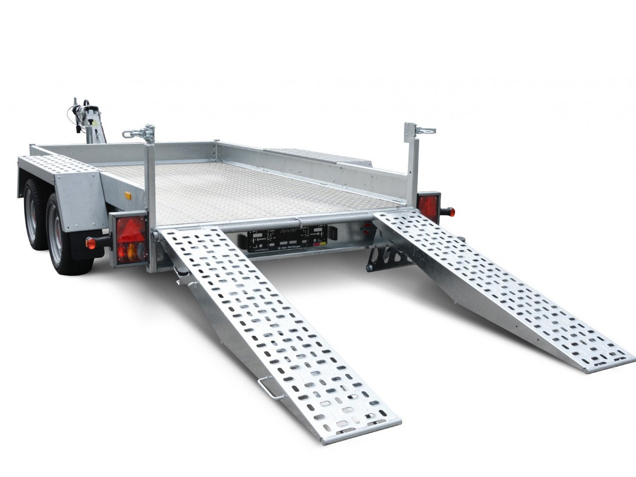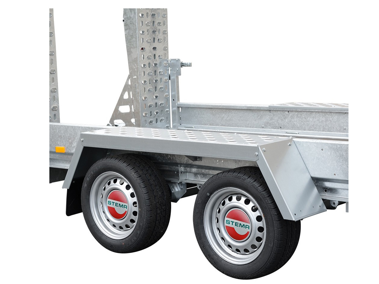 Für jeden Einsatz. Der universell einsetzbare STEMA-Baumaschinentransporter ist der ideale Begleiter für den gewerblichen Einsatz. Baumaschinen und andere Arbeitsgeräte lassen sich durch den extrem niedrigen Auffahrwinkel (18°) über die stabilen Auffahrrampen (1,70 m lang) mühelos verladen. Die Ladehöhe beträgt ca. 46 cm.