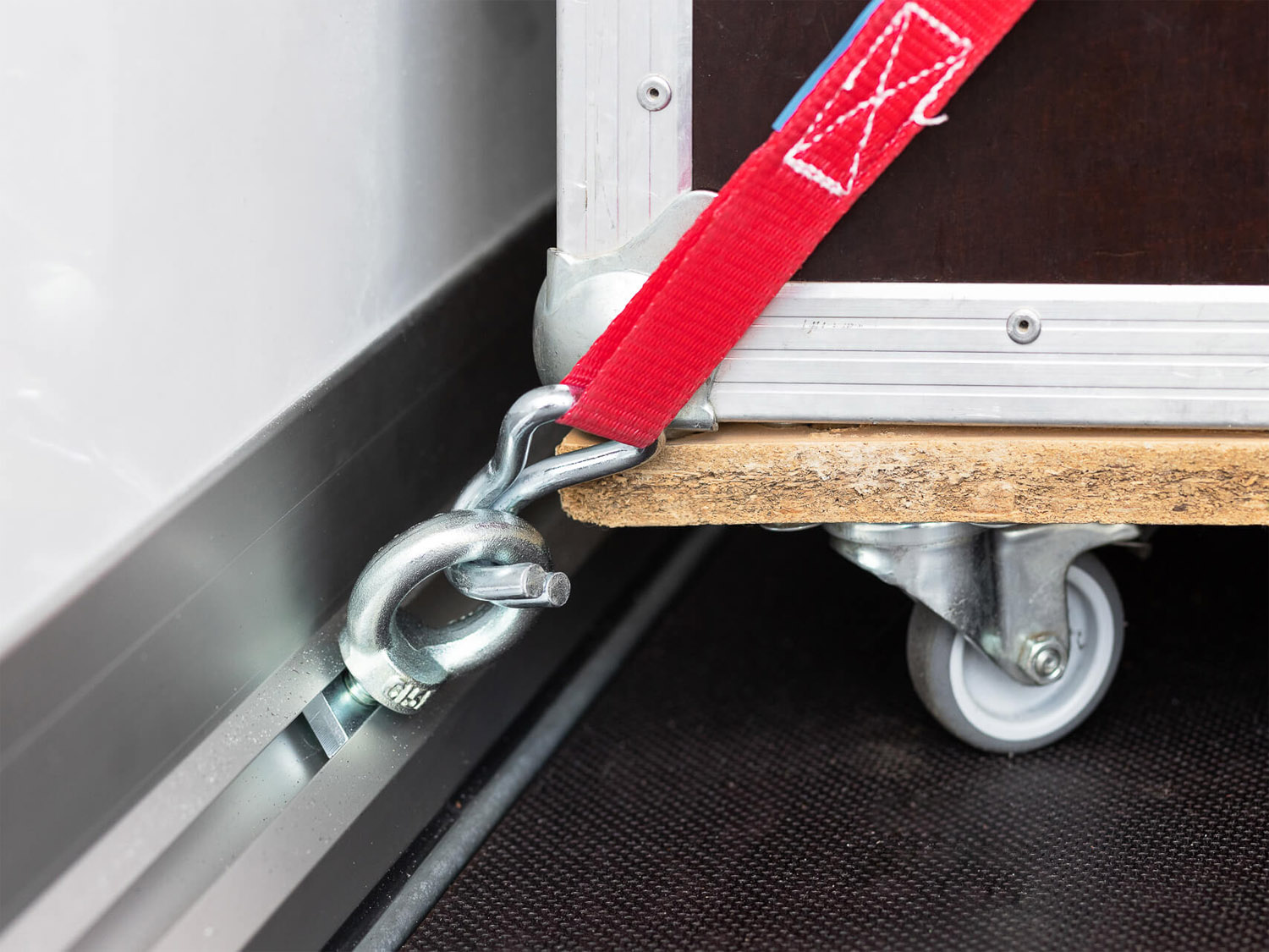 Schon in der Standardausführung ist von jeder Stelle aus eine diagonale Abspannung vom Boden bis zur Decke möglich. Auf Wunsch gibt es weitere Verzurrlösungen, die mit flexibel arretierbaren Stangen arbeiten und allerhöchste Ansprüche an die Ladungssicherung erfüllen.
