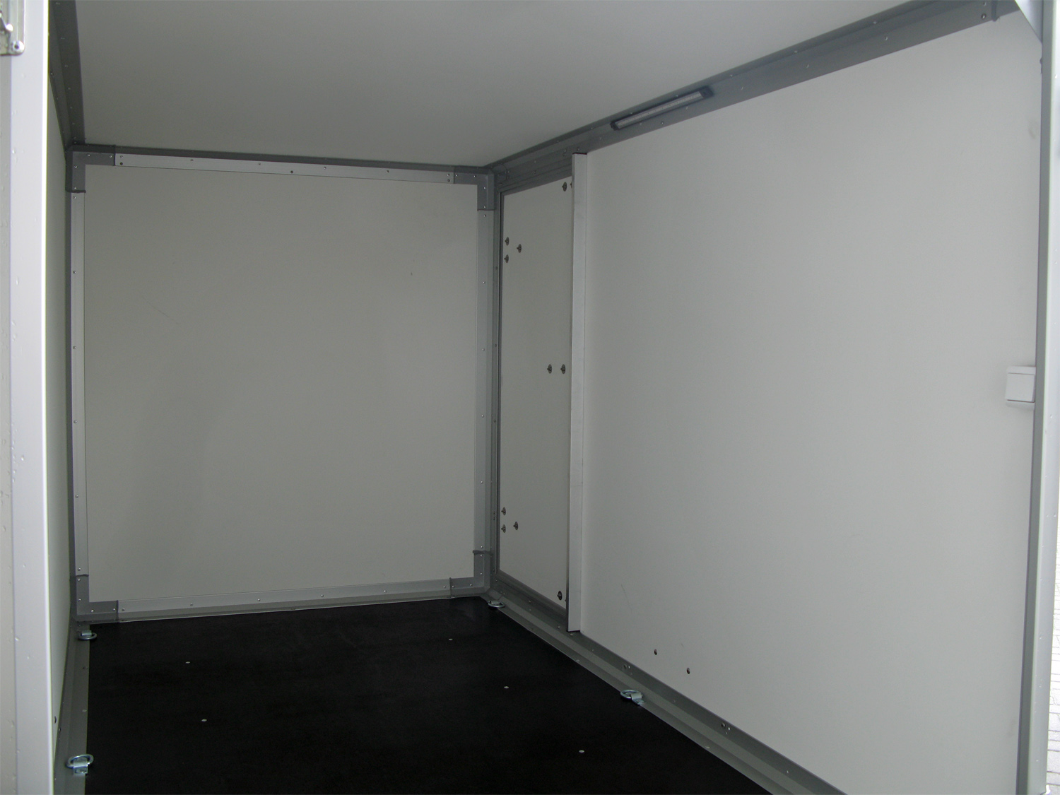 Der Anhänger ist mit zwei Hecktüren mit Stangenschloss ausgestattet, die einen einfachen und sicheren Zugang zum großzügigen Laderaum ermöglichen. Die Innenbeleuchtung (12 Volt LED) und sechs Zurrösen im Innenraum erleichtern das Beladen und Sichern des Ladeguts auch bei schlechten Lichtverhältnissen. Für mehr Flexibilität kann der Anhänger optional mit einer Heckrampe ausgestattet werden, wodurch das Verladen von schweren oder rollenden Gegenständen erleichtert wird. Zusätzlich können Zurrschienen gewählt werden, um bessere Möglichkeiten zur Ladungssicherung während des Transports zu bieten.