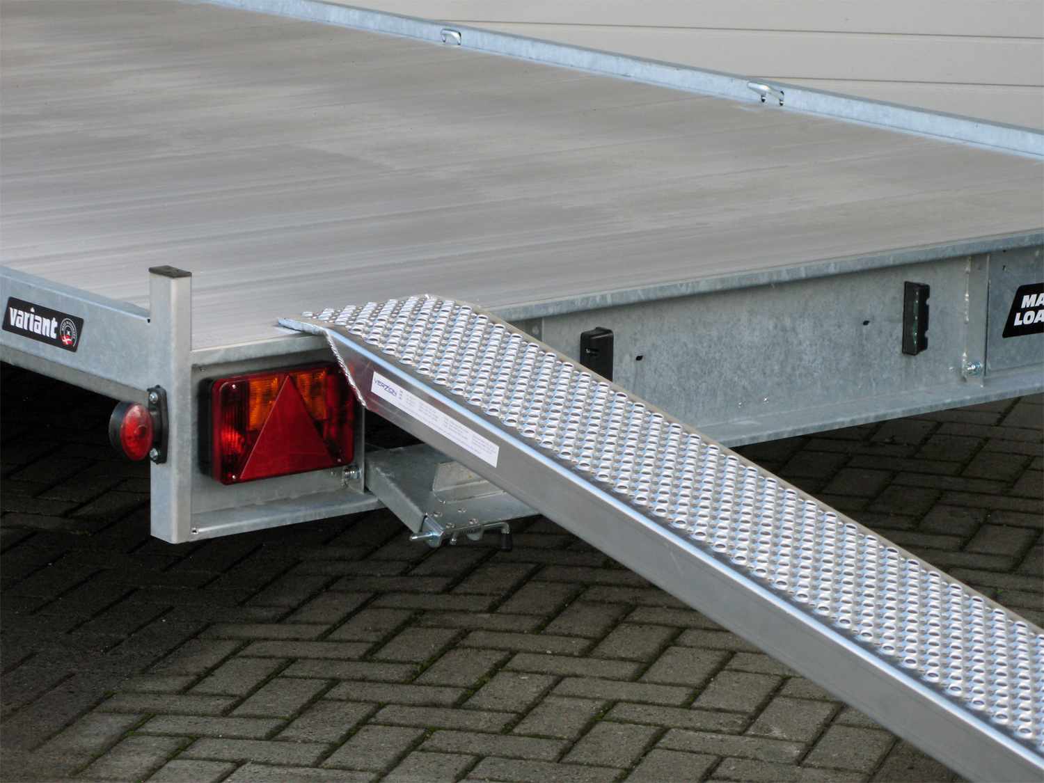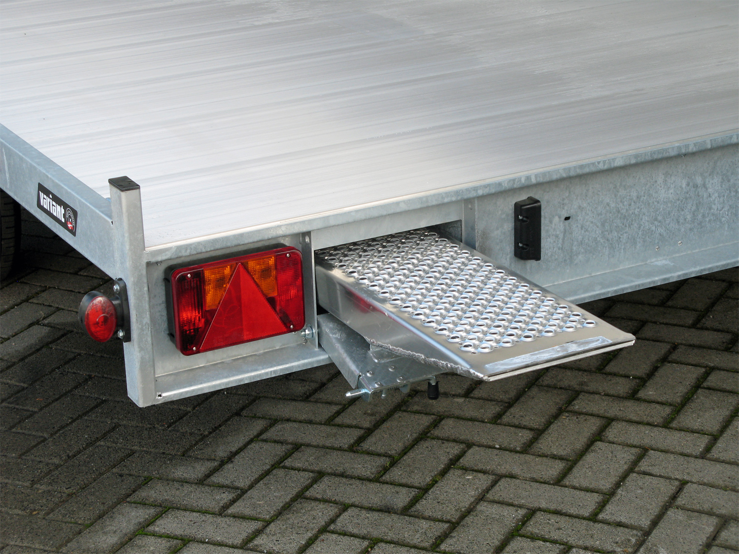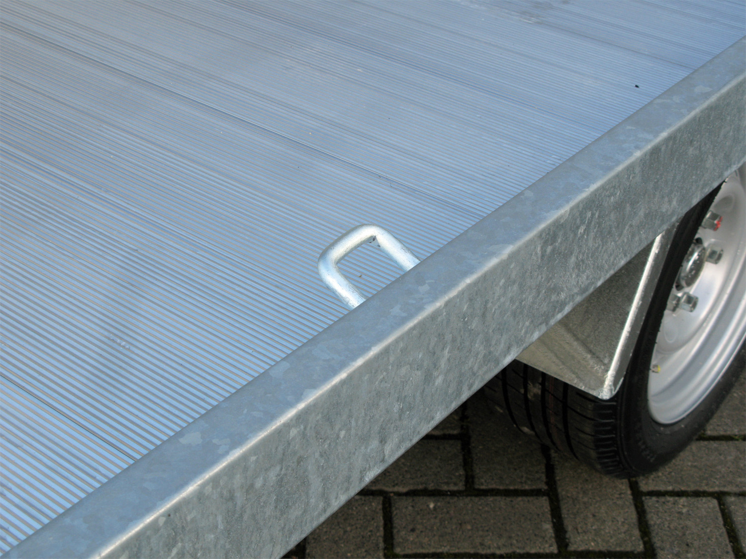Mit 10 innenliegenden Zurrösen lässt sich die Ladung einfach und sicher befestigen. Der Anhänger verfügt über Rampenkassetten unter der Ladefläche und ist mit einer manuellen Seilwinde ausgerüstet, wodurch er sich ideal für den Transport kleinerer Fahrzeuge oder Maschinen eignet.