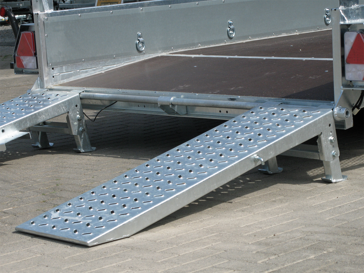 Mit einer Ladehöhe von nur 29 cm können alle Auffahrten problemlos bewältigt werden – egal ob es sich um eine Arbeitsbühne, Bagger, etc. handelt. Die Maxi-Load-Modell besitzen robuste Parabelfedern sowie ein voll verschweißtes und feuerverzinktes Fahrgestell. Der Anhänger ist als Standard mit 2 verschiebbaren Rampen ausgestattet. Es erlaubt somit einen nach hinten gerichteten Überhang und für eine angepasste Gewichtsverteilung. Alle Modelle können gegen Aufpreis mit kompletter Heckrampe geliefert werden. Stützbeine an den beiden Rampentypen sorgen für eine stabile Unterstützung beim Be- und Abladen. Die Rampenlänge ist 130 cm. Zur Serienausstattung gehören robuste Trittplatten an den Seiten, Verzurrösen, Schaufelablage und Stützrad. Die B4 Modelle sind außerdem mit Ersatzrad unter der Schaufelablage montiert.